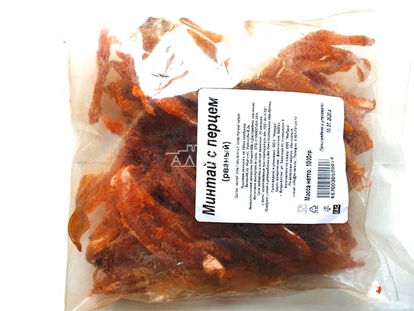 Минтай  с перцем (рваный) по цене доступной для каждого покупателя можно купить на нашем сайте. Эта вкусная сушеная рыбка отлично подойдет как закуска к пиву и придется по душе любой компании. Рыбный снек обладает красивым янтарным оттенком, пряным, острым вкусом. Соломка имеет мягкую текстуру и соленый, морской аромат. Изготавливается рыбка из филе и спинки минтая путем промывки,  посола, добавления специй и просушивания в естественных условиях. В своем составе вяленый продукт содержит только рыбу, соль и перец, что делает его натуральным и качественным.